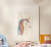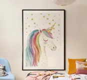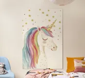 Diese zauberhafte Aquarell Illustration eines Einhorns mit einer bunten Pastel Mähne und Sternenhimmel fängt die Magie und Fantasie der Märchenwelt perfekt ein und begeistert Kinder mit ihrem niedlichen, minimalistischen Design.