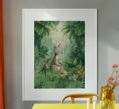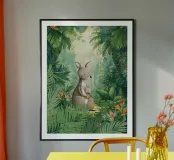 Ein herzerwärmender Aquarelldruck einer Kängurumutter, die ihr Junges in einem üppigen tropischen Dschungel kuschelt. Perfekt für Kinderzimmer oder jeden, der sanfte Tiere und gemütliche Waldatmosphäre liebt.