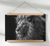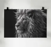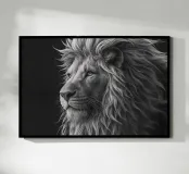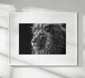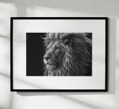 Dieses eindrucksvolle Schwarz-Weiß-Porträt eines majestätischen Löwen zeigt die beeindruckende Mähne und die kraftvolle Schnautze in detailreicher Nahaufnahme. Die minimalistische Komposition und die feine Fellstruktur unterstreichen die natürliche Schönheit und Stärke dieses wildlebenden Tieres.