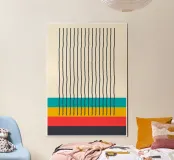Ein lebhaftes abstraktes Poster im Stil der Jahrhundertmitte mit einem Raster aus 16 handgezeichneten, vertikalen dunklen Linien, die sich über die Komposition erstrecken. Die Linien werden von vier horizontalen Farbblöcken unterlegt: Teal, Senfgelb, Hellrot und ein tiefes Anthrazitgrau. Der Hintergrund ist ein weiches, warmes Beige, das dem Kunstwerk einen organischen Vintage-Look verleiht. Diese digitale Posterdatei (7000x5000 Pixel, 300 dpi) bietet eine hervorragende Klarheit und satte Farbqualität, was sie zu einem erstklassigen Kunstwerk macht, das sich perfekt für eine minimalistische oder retro-inspirierte Einrichtung eignet.