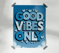 Füllen Sie Ihren Raum mit Positivität und Stil mit diesem Digitaldruck "Good Vibes Only". Dieses lebendige Grafikdesign zeigt die aufmunternde Botschaft in orangefarbenem Text vor einem dynamischen, verzogenen gelb-weiß karierten Hintergrund, umgeben von verspielten Illustrationen lächelnder Blumen, Herzen, Emojis und anderen coolen Symbolen. Es verkörpert eine retro-inspirierte Ästhetik, die Glück und gute Laune verbreiten soll. Diese hochwertige digitale Reproduktion hat eine Auflösung von 7000x5000 Pixeln bei 300 dpi, was eine hervorragende Klarheit, scharfe Linien und brillante Farben garantiert. Ein idealer Druck für