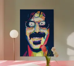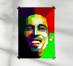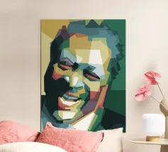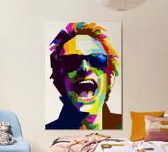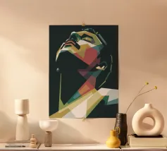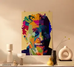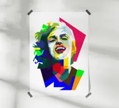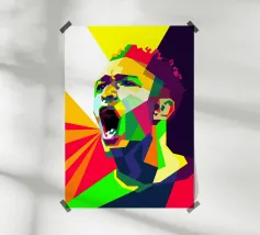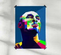 Ein lebhaftes und geometrisches Porträt von Sinead O'Connor im WPAP-Stil mit kühnen, kantigen Formen und einer auffälligen Reihe heller, kontrastreicher Farben. Das Kunstwerk fängt ihre ikonischen Merkmale, wie ihren rasierten Kopf, ihre stechenden Augen und ihren starken Gesichtsausdruck, mit scharfen, fragmentierten Farbblöcken ein. Die Komposition betont Tiefe und Emotionen und behält gleichzeitig die unverwechselbare kubistische Pop-Art-Ästhetik von WPAP bei, wodurch eine visuell dynamische und moderne Hommage an die legendäre Sängerin entsteht.