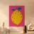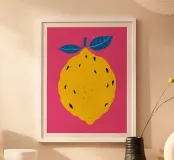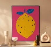Eine große, einzelne gelbe Zitrone, illustriert mit einem strukturierten, düsteren Stil vor einem leuchtend rosa Hintergrund. Das Werk ist eine kühne, moderne und grafische Pop-Art-Interpretation einer klassischen Frucht.