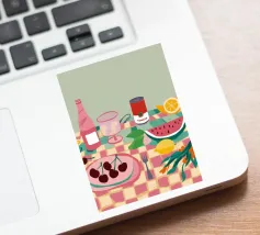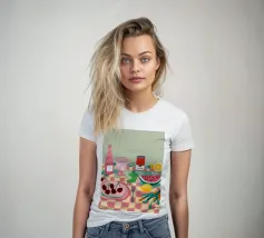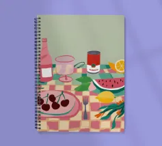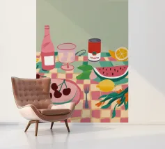 Eine bezaubernde Sommer-Picknick-Szene auf einer rosa Gingham-Decke, komplett mit Wassermelone, Kirschen, einem Getränk und einem Buch, die an einen perfekten, gemütlichen Tag erinnert.