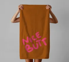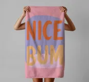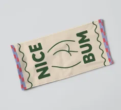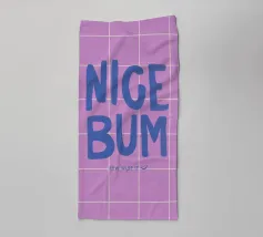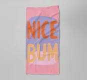 Die bunte Illustration Malerei mit minimalistischer Typografie präsentiert den humorvollen Spruch "Nice Bum" in fetten Buchstaben. In Pastel Farben von Rosa, Violett, Orange und Hellblau wird das Gesäß kreativ inszeniert. Diese verspielte Darstellung feiert Körperlichkeit und Erotik auf abstrakte Weise.