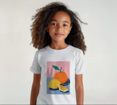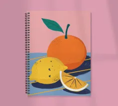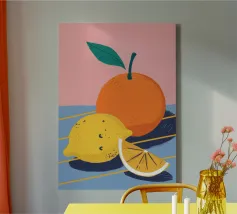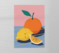 Ein minimalistisches Stillleben, das sich auf eine einzelne Orange und eine Zitrone konzentriert, von denen eine Scheibe abgeschnitten ist. Die einfache Komposition und die Art und Weise, wie das Licht auf die Früchte fällt, schaffen eine schöne, frische und elegante Studie von Form und Farbe.