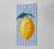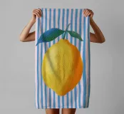 Diese minimalistische Illustration zeigt eine gelbe Zitrone vor einem Hintergrund mit hellblauen, rosa und weißen Streifen. Die frischen Farben und das grafische Design verleihen der Küche einen mediterranen Sommerakzent. Perfekt als Kunstwerk für Feinschmecker und Liebhaber der Botanik!