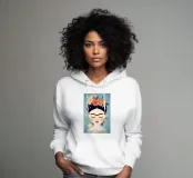 Digitales Porträt Malerei von Frida Kahlo im Boho-Stil begeistert mit floralen pastel Elementen und leuchtenden Farben wie hellblau, Rosa und Gelb, die ihre ikonischen Merkmale wunderbar zur Geltung bringen. Perfekt für moderne Inneneinrichtungen oder Kinderzimmer, verkörpert es die Schönheit der Modernen Graphic Kunst und inspiriert zugleich.
