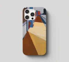 Die strenge Geometrie eines überdachten Gehwegs wird durch kühne karminrote Säulen und die langen, scharfen Schatten, die sie im hellen Sonnenlicht werfen, bestimmt. Dieses Gemälde ist eine kraftvolle Studie von Licht, Schatten, Farbe und architektonischer Form.