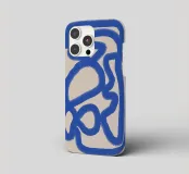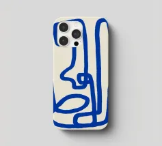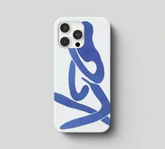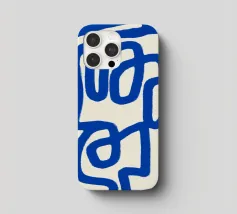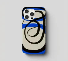 Eine dicke, blaue Linie schlängelt sich über einen neutralen Hintergrund und schafft ein abstraktes Muster mit kühnen, geschwungenen Formen. Die Schlichtheit des Designs unterstreicht die Bewegung und den Fluss der durchgehenden Linie.