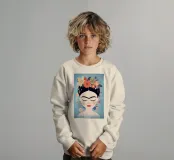 Digitales Porträt Malerei von Frida Kahlo im Boho-Stil begeistert mit floralen pastel Elementen und leuchtenden Farben wie hellblau, Rosa und Gelb, die ihre ikonischen Merkmale wunderbar zur Geltung bringen. Perfekt für moderne Inneneinrichtungen oder Kinderzimmer, verkörpert es die Schönheit der Modernen Graphic Kunst und inspiriert zugleich.