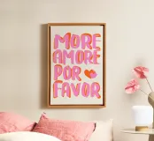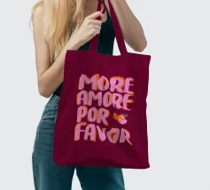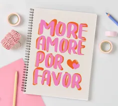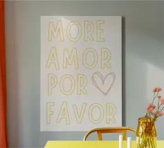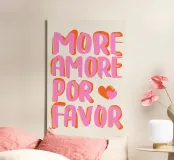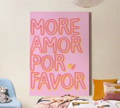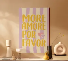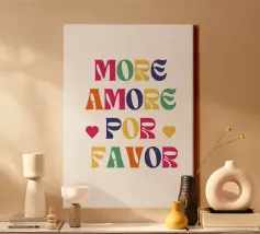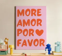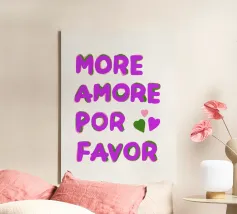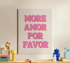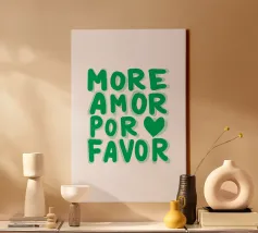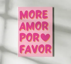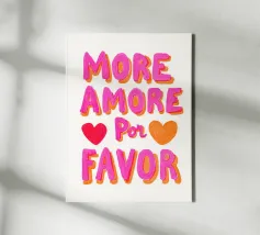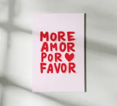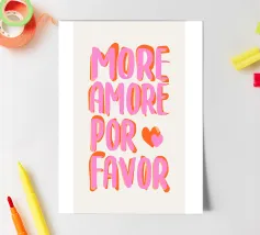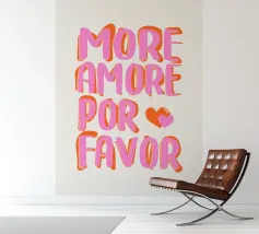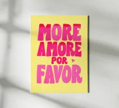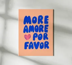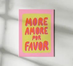 Das Bild ist ein lebhaftes Poster mit einem verspielten, künstlerischen Design. Der Hintergrund ist hellbeige, und der Text ist in großen, fetten Buchstaben in Rosa- und Rot-Orange-Tönen geschrieben. Die Botschaft lautet: „MORE AMORE POR FAVOR“, was auf Englisch so viel heißt wie ‚Mehr Liebe, bitte‘. Die Worte sind in drei Zeilen angeordnet, und rechts von der untersten Zeile befinden sich zwei Herzen, eines in Rot-Orange, das andere in Rosa, die sich leicht überlappen. Der Gesamtstil ist fröhlich und einladend und vermittelt eine Botschaft der Liebe und Positivität.