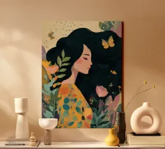 A portrait of a woman with flowing red hair, surrounded by stylized leaves and flowers, looking thoughtfully to the side. The style is modern, bold, and slightly art nouveau.