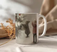 Friedliche Winterszene mit einem Kind in einem weißen Mantel und einem rosa Schal, das sich nach einem kleinen, beleuchteten, schneebedeckten Baum ausstreckt, umgeben von hohen, verschneiten Bäumen.