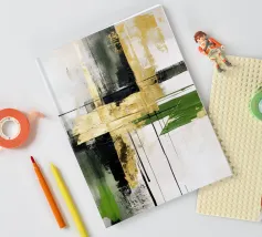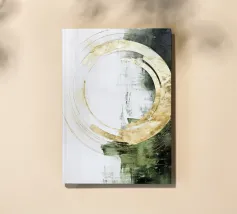 Dieses Kunstwerk ist eine abstrakte Komposition im Panoramaformat, die sich durch eine dynamische Mischung aus Texturen, Farben und geometrischen Formen auszeichnet. Die Textur ist reichhaltig, mit sichtbaren Pinselstrichen und Farbschichten, die eine besondere Atmosphäre schaffen. Das Zusammenspiel von Grün- und Erdtönen mit metallischen Akzenten verleiht dem Werk eine harmonische und zugleich lebendige Energie.