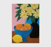 Ein elegantes und einfaches Stillleben mit einem Strauß gelber Blumen in einer dunklen Vase neben einer tiefblauen Schale mit frischen Orangen. Die Komposition ist heiter und zeitlos, mit einem schönen Kontrast der Farben.