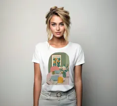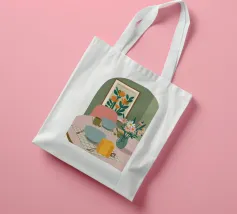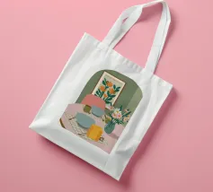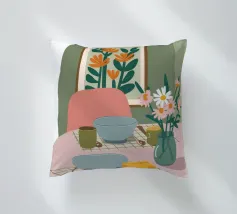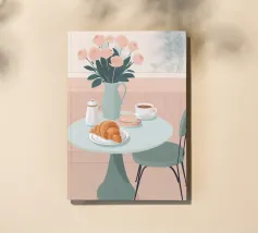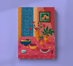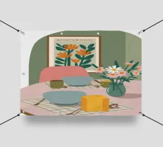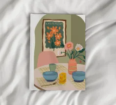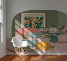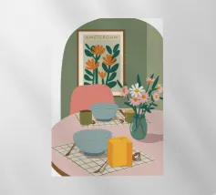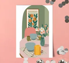 Ein wunderschönes Stillleben mit einem Mohnblumenstrauß auf einem Esstisch und einem gerahmten Kunstwerk im Stil von Maraouri an der Wand. Die Szene ist eine elegante und künstlerische Mischung aus floraler Schönheit und moderner Kunstgeschichte.