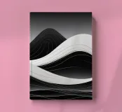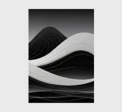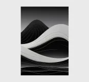 Gebogene schwarze und weiße Wellen wellen sich über die Leinwand und bilden eine abstrakte Landschaft. Die fließenden Übergänge schaffen ein Gefühl von Rhythmus und Tiefe und laden zu Kontemplation und Kreativität ein.