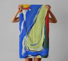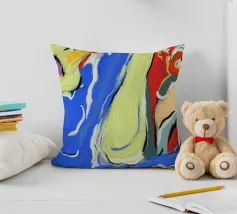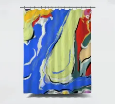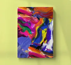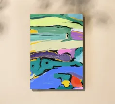 Kräftige blaue und grüne Strudel verflechten sich mit leuchtendem Rot und Orange zu einer dynamischen und energiegeladenen Komposition. Abstrakte Formen und breite Pinselstriche erwecken ein Gefühl von Bewegung und Fluidität