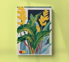 Dieses Kunstwerk zeigt eine Pflanze mit langen grünen Blättern und rosa Blüten. Der Hintergrund besteht aus abstrakten Formen in Rosa und Grün, die dem botanischen Thema einen Hauch von Eleganz verleihen.