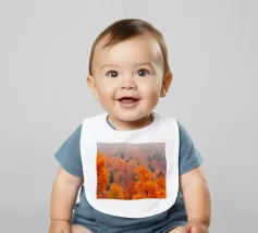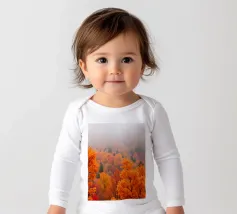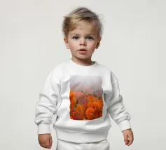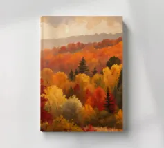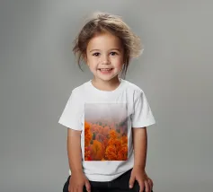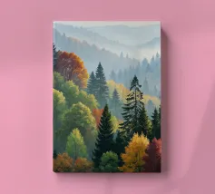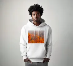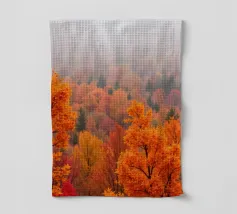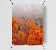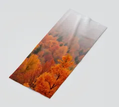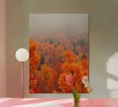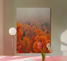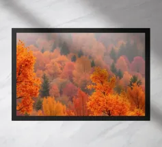 Bunte Bäume in Orange-, Rot- und Gelbtönen füllen den Wald, während der Nebel tief hängt und eine heitere und malerische Herbstkulisse schafft.