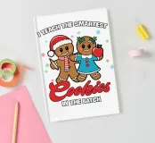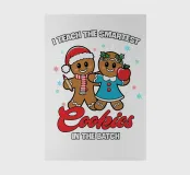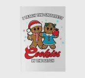 Zwei lächelnde Lebkuchen sind festlich gekleidet, wobei einer eine Weihnachtsmannmütze trägt und der andere einen Apfel in der Hand hält. Um sie herum ist der Satz "I teach the smartest cookies in the batch" (Ich unterrichte die klügsten Kekse in der Gruppe) gedruckt, der ein spielerisches, pädagogisches Thema hinzufügt.