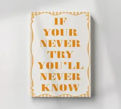 Strahlen Sie Positivität aus mit unserem lebendigen Typografie-Kunstdruck "If You Never Try You Will Never Know". Diese aufmunternde Botschaft, die in verspielten, orangefarbenen, handgezeichneten Buchstaben vor einem auffallend blauen, marineblauen Hintergrund dargestellt ist, bildet einen auffälligen Kontrast, der jeden Raum erhellen wird. Das skurrile Design fängt den unbekümmerten Geist des Satzes perfekt ein und lädt Positivität in Ihr Zuhause, Ihr Büro oder Ihren persönlichen Stil ein. Dieses vielseitige Kunstwerk, das auf verschiedenen Produkten erhältlich ist, ist ideal, um überall gute Laune zu verbreiten. Lassen Sie diesen charmanten Druck als