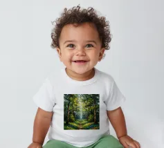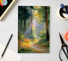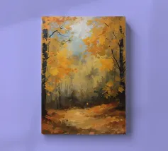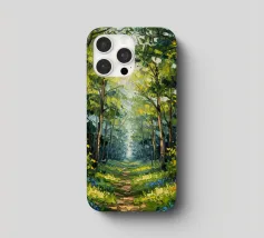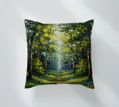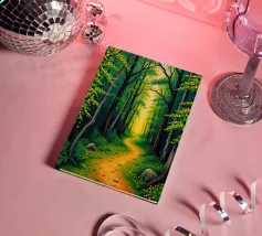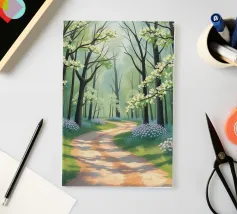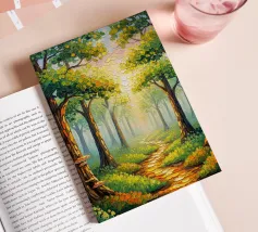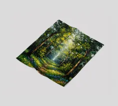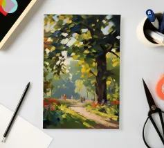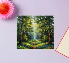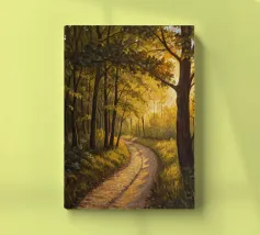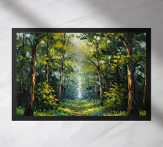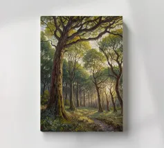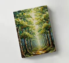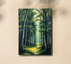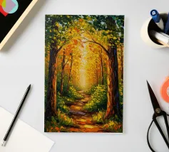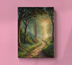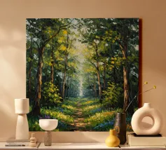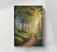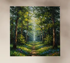 Tauchen Sie mit diesem beeindruckenden impressionistischen Ölgemälde in einen sonnendurchfluteten Traum ein. Dieses mit einer dynamischen Spachteltechnik geschaffene Werk erweckt eine lebendige, dreidimensionale Textur zum Leben. Ein gewundener Pfad führt den Betrachter tief in einen üppigen Wald, in dem hoch aufragende Bäume mit reichhaltiger, strukturierter Rinde einen natürlichen Torbogen bilden. Das Sonnenlicht strömt durch das Blätterdach und beleuchtet die leuchtend grünen und gelben Blätter, was ein Gefühl von Hoffnung und Entdeckung vermittelt. Der Vordergrund ist ein Wandteppich aus Wildblumen in leuchtenden Blau-, Violett- und Gelbtönen, der dazu einlädt, in diese heitere und magische Landschaft einzutauchen. Dieses Kunstwerk