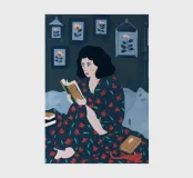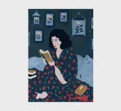 Eine Illustration einer Frau, die im Bett ein Buch liest, während eine Katze friedlich neben ihr schläft. Die Szene ist eine herzerwärmende, kuschelige und heitere Darstellung der perfekten, ruhigen Kameradschaft.