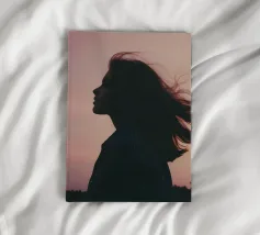 Die Silhouette steht vor einem dunklen Hintergrund, der von einer sanften Lichtquelle von hinten beleuchtet wird, die einen sanften Schimmer um das Haar herum erzeugt. Die Atmosphäre ist ruhig