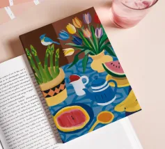 Eine friedliche Innenszene eines Küchentisches mit einer Vase mit orangefarbenen Tulpen. Aufgeschnittenes Obst und Schalen sind ordentlich auf dem gelben Tischtuch arrangiert, aus einem Winkel betrachtet, der einen ruhigen, sonnenbeschienenen Nachmittag suggeriert.