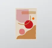 Ein minimalistisches abstraktes Kunstwerk mit einem strukturierten, rosafarbenen Hintergrund und einfachen, ausgewogenen Formen in Rot und Creme. Das Werk ist anspruchsvoll, modern und hat eine ruhige, taktile Qualität.