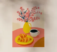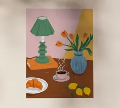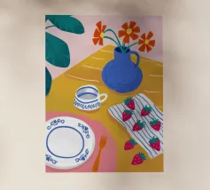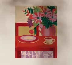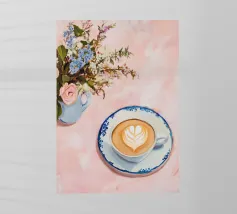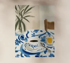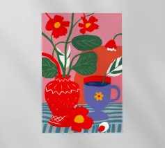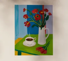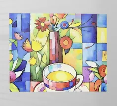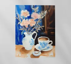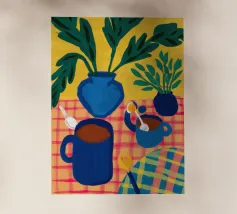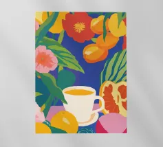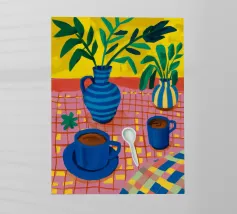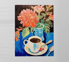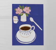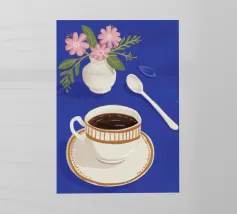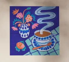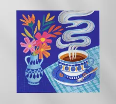 Eine skurrile Illustration einer Tasse dampfenden Kaffees in einer blau-weiß karierten Tasse mit darüber schwebenden stilisierten Blumen vor einem dunkelblauen, gewellten Hintergrund.
