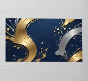 Dieser elegante, abstrakte Hintergrund zeigt fließende Gold- und Silberelemente mit kreisförmigen Akzenten auf einer sattblauen Leinwand und sorgt so für eine beeindruckende visuelle Wirkung, die sich für kreative Projekte eignet.