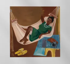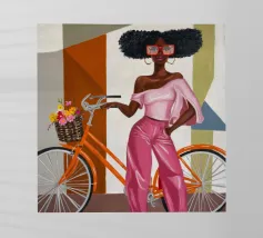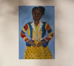 Dieses Kunstwerk zeigt eine Person, die auf einem gestreiften Stuhl sitzt, umgeben von Sonnenblumen und einer grünen Tasche. Der Hintergrund ist ein gedämpftes Braun, das eine rustikale und nachdenkliche Atmosphäre schafft.