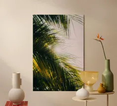 A detailed composition of sunlit palm fronds overlapping in elegant curves. With a soft teal backdrop and architectural accents, this image offers a fresh tropical perspective—ideal for editorial decor or botanical-inspired spaces.