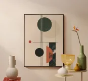 Dieses einzigartige Motiv kombiniert geometrische Formen mit einer harmonischen Farbpalette aus Grün, Schwarz und Rot auf einem warmen beigen Hintergrund. Die präzise Anordnung von Linien, Kreisen und Halbkreisen verleiht dem Design eine moderne und zugleich kunstvolle Ausstrahlung. Perfekt für Wandbilder, Kissen, Handyhüllen und vieles mehr – ideal für alle, die zeitgenössische Ästhetik in ihren Alltag integrieren möchten.