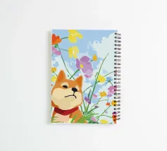 dog flowers clouds blue sky grass red collar field sunny day spring outdoors nature yellow flowers purple flowers orange flowers green stems floral pattern pet animal landscape vibrant colors