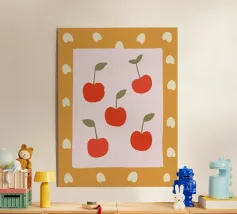 This modern wall mural shows stylised, bright red cherries on a graphically drawn branch with delicate, pink leaves and textures. The combination of bold colour accents and fine textures creates a harmonious interplay of freshness and elegance. The minimalist depiction in pastel and red tones makes this motif an ideal eye-catcher in the kitchen, dining room or creative living room.
