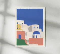 A bold and modern illustration of Cologne’s iconic cathedral rising above a row of charming riverside houses. The twin Gothic spires stand tall against a deep blue sky, softly textured and illuminated by a warm golden moon. The cathedral’s pink tones contrast beautifully with the vibrant rooftops below, creating a striking yet harmonious composition.