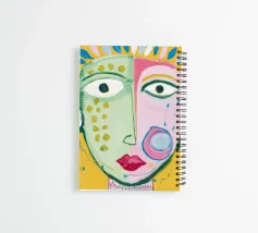 This painting shows a face split into two halves, each with different colors and patterns. One side is green with polka dots, while the other is purple with abstract shapes.
