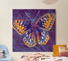Lebendiges Kunstwerk mit einem auffälligen rosa Schmetterling vor einem kräftigen orangefarbenen Hintergrund. Die filigranen Flügeldetails des Schmetterlings und die leuchtenden Magentatöne bilden einen schönen Kontrast zu der satten, strukturierten orangefarbenen Leinwand. Dieses einzigartige Design bringt Freude und natürliche Schönheit in jeden Raum und ist ideal für Kunst- und Naturliebhaber, die einen Farbakzent setzen möchten.