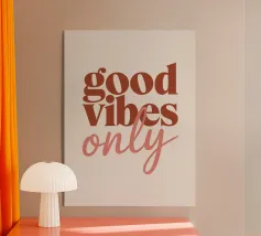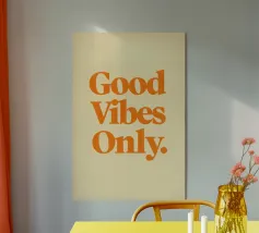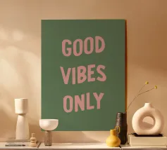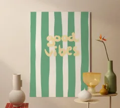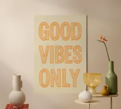 Eine helle und aufmunternde Botschaft für ein glückliches Zuhause. Dieses handgeschriebene Kunstwerk zeigt die klassische Phrase "GOOD VIBES ONLY" vor einem fröhlichen gestreiften Hintergrund.