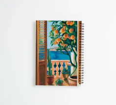 A view through a window of a beautiful orange tree, heavy with ripe fruit. The warm, sun drenched light and charming subject create a scene of rustic, Mediterranean abundance.