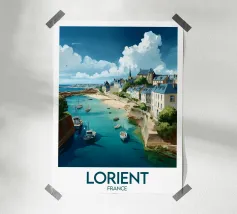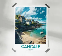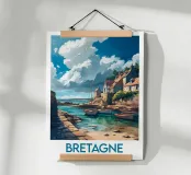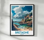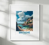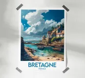 Illustration eines kleinen bretonischen Hafens mit vertäuten Booten, typischen Steinhäusern und einem dramatischen Himmel. Diese Szene ruft die wilde und authentische Schönheit der Bretagne hervor und eignet sich perfekt für eine Wanddekoration mit maritimem Flair.