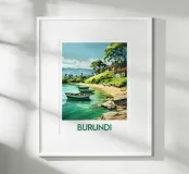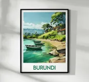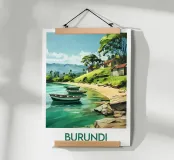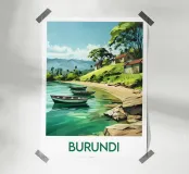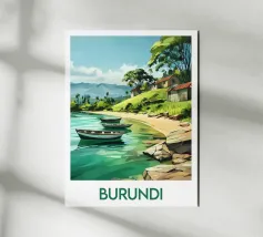 A peaceful lakeside scene in Burundi, with boats floating on turquoise water, gently sloping houses and mountains in the background. An ideal illustration for a soft, natural wall decoration.