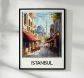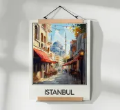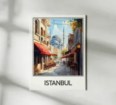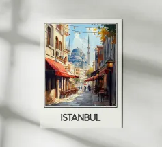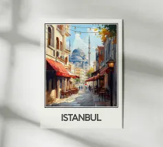 Entdecken Sie die magische Atmosphäre von Istanbul mit diesem wunderschönen Reiseposter. Eine belebte Gasse mit traditionellen Cafés führt zur ikonischen Blauen Moschee, die in einem warmen Licht und unter einem klaren Himmel liegt. Eine ideale Wanddekoration für einen Hauch von orientalischer Eleganz und Geschichte.