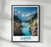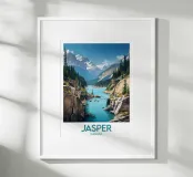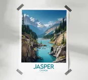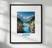 This poster illustrates the wild beauty of Jasper, in the heart of the Canadian Rockies, with its towering cliffs, turquoise river and snow-capped mountains. An ideal wall piece for lovers of unspoilt nature.