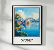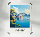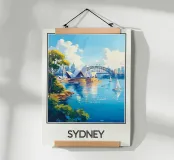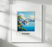 Sublime Illustration von Sydney, die das ikonische Opernhaus und die Harbour Bridge unter einem sonnigen Himmel einfängt. Die Segelboote, die friedlich auf dem blauen Wasser treiben, verleihen dem spektakulären Anblick einen Hauch von Gelassenheit. Ein perfektes Werk für Liebhaber von Architektur und Stadtlandschaften, ideal für eine moderne und elegante Wanddekoration.