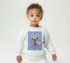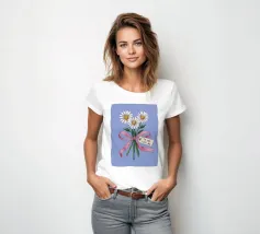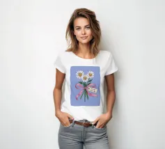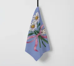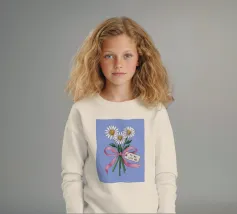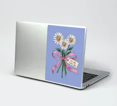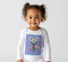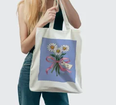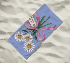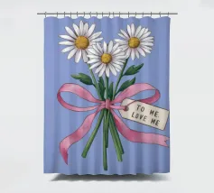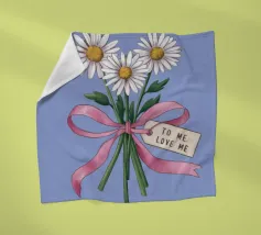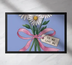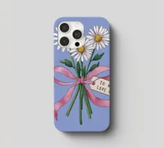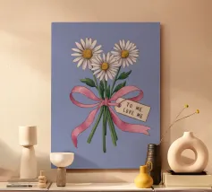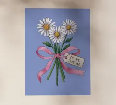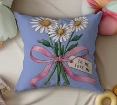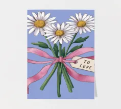 Eine süße und romantische Illustration eines Straußes weißer Gänseblümchen, gebunden mit einem rosa Band. Ein kleines Schildchen mit der Aufschrift "Für meine Liebe" ist angebracht und macht dies zu einer perfekten Darstellung einer herzlichen, romantischen Geste.